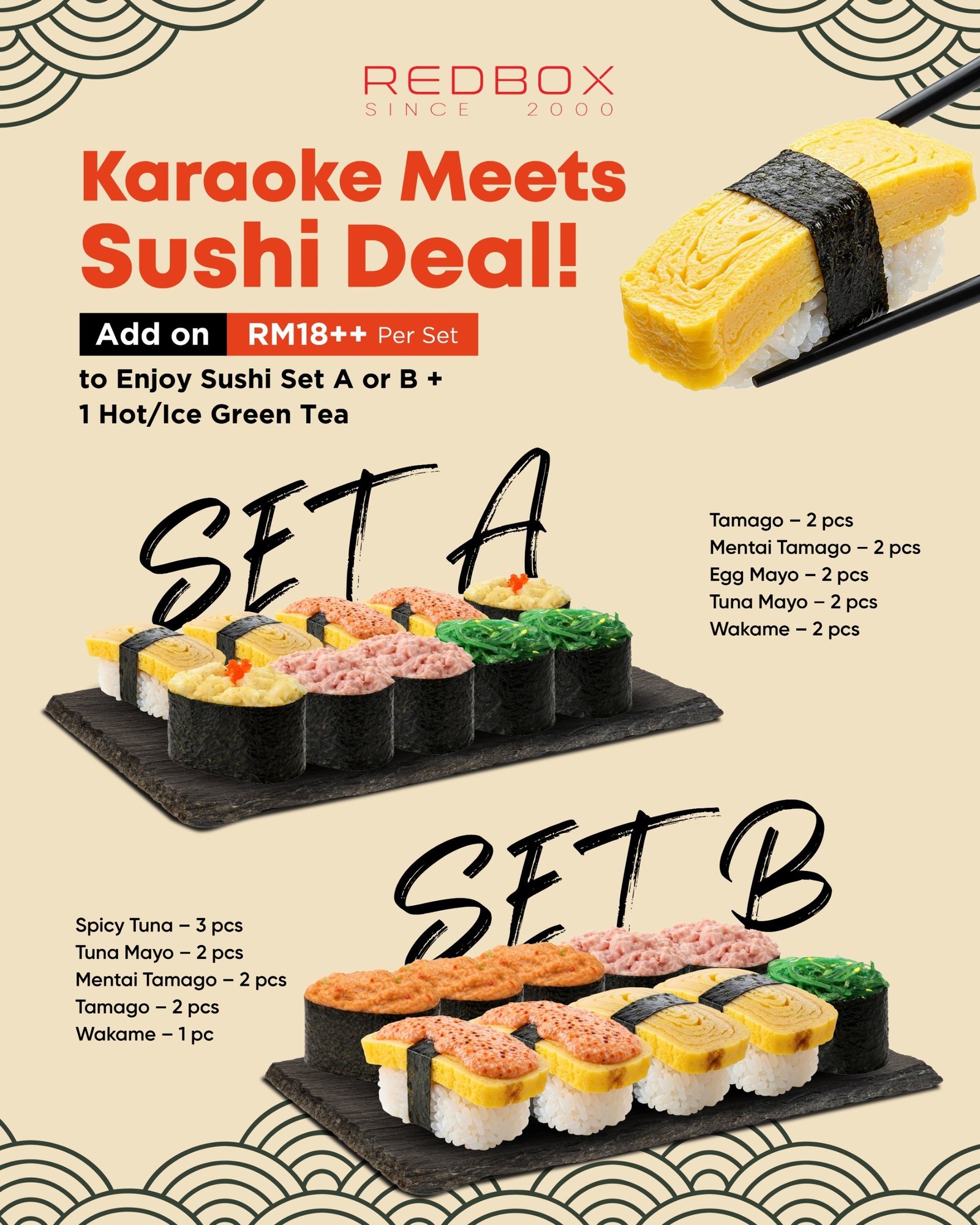 For just RM18++ Per Set, enjoy a Sushi Set paired with a glass of Hot or Iced Green Tea while you sing your favorite songs.