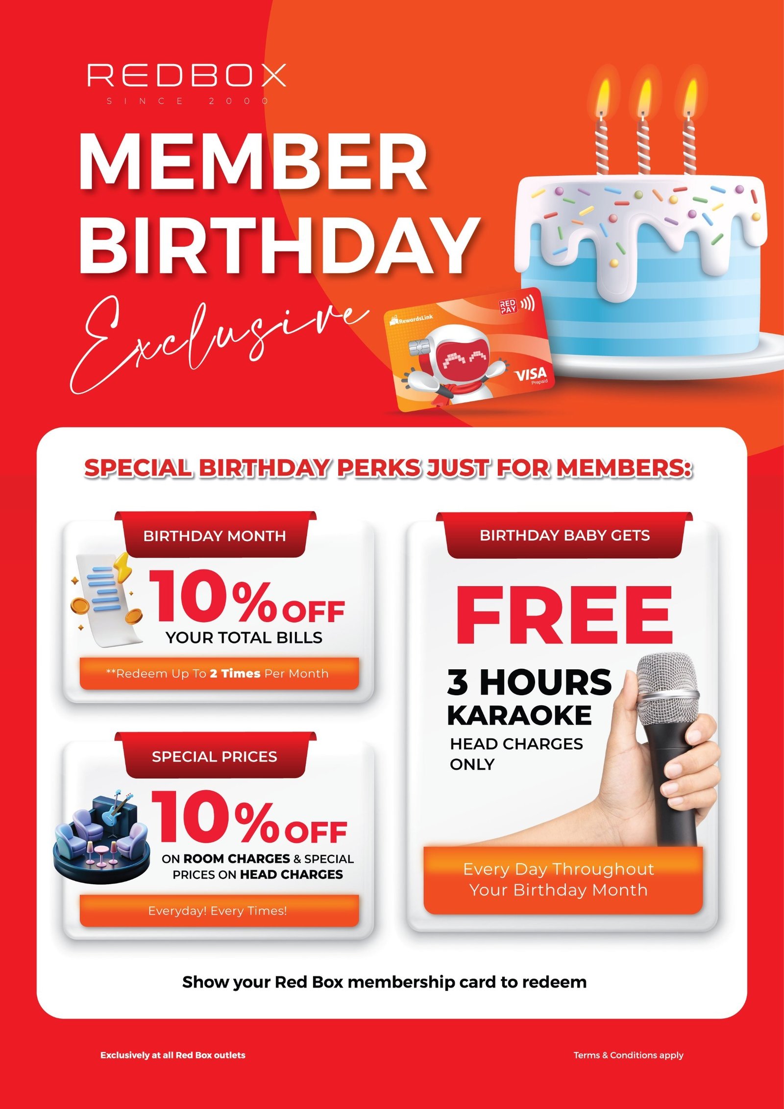 Birthday members must present their NRIC and Red Pay Visa Card during check-in for verification purposes.