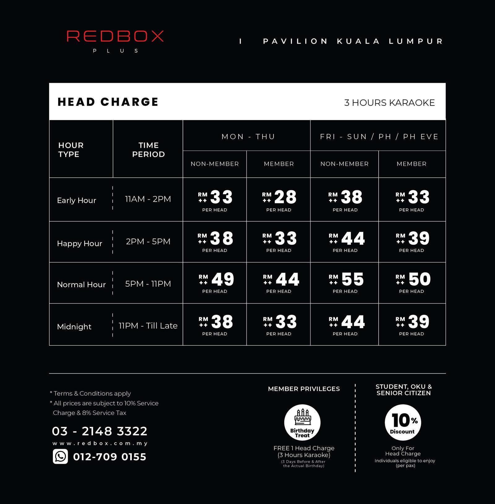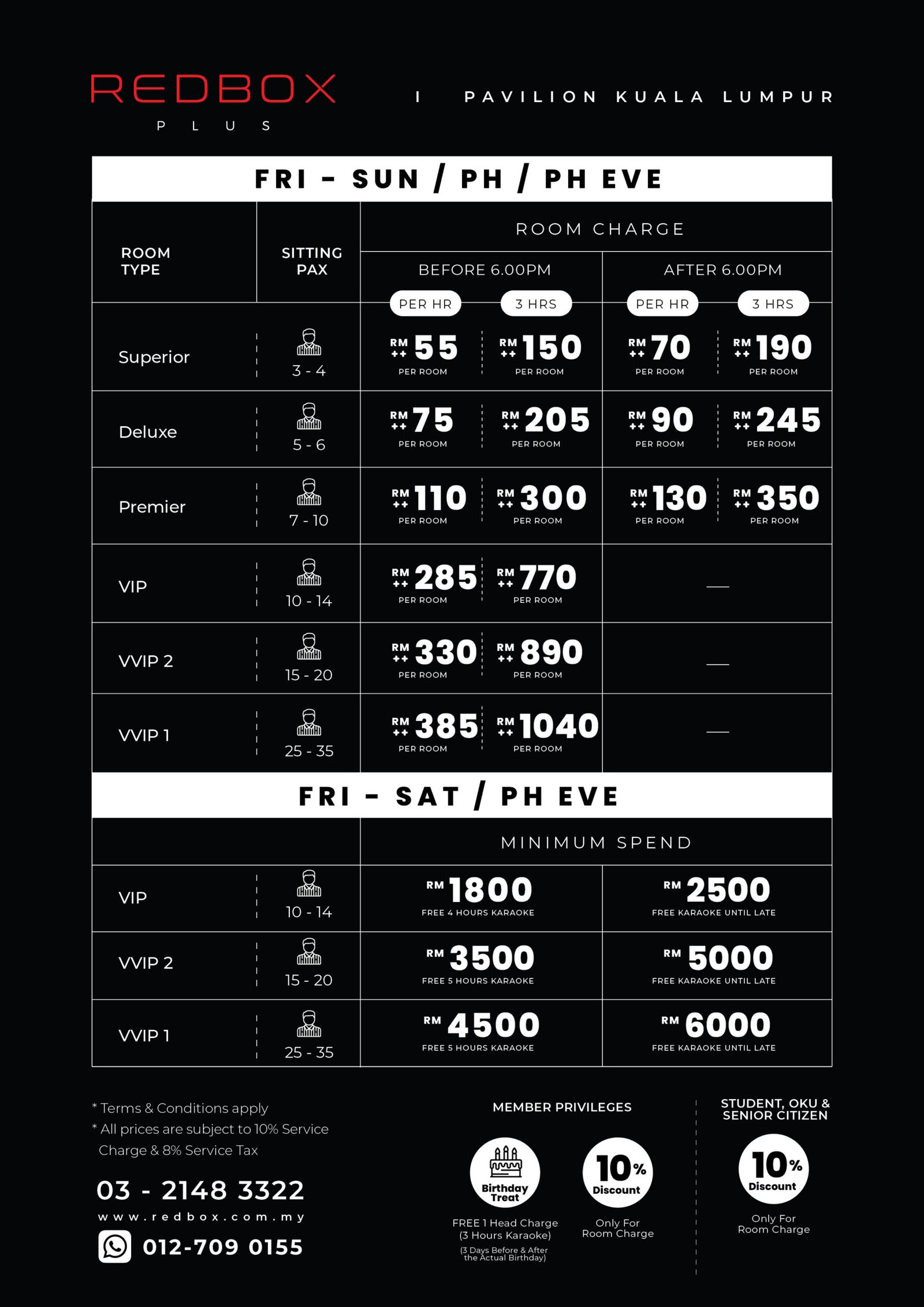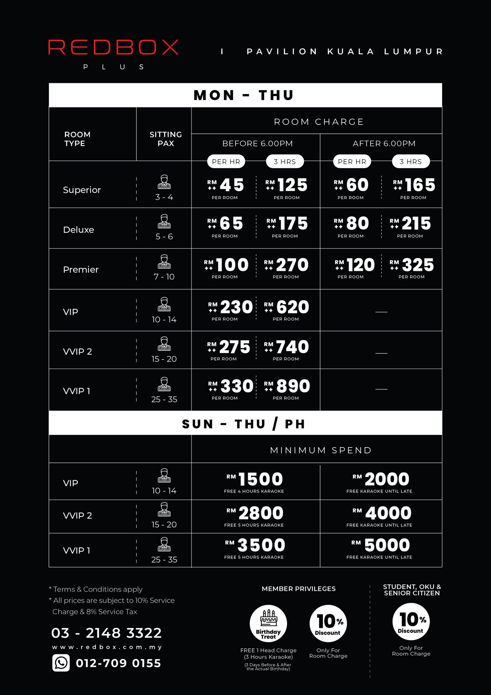 - Basic Package is compulsory when checking into VIP & VVIP rooms, please contact the Red Box Plus Receptionist at 03-2148 3322, Red Box Customer Service at 03-7660 3990 (Office Hours: 9 am – 6 pm), or Red Box Karaoke’s official Facebook and Instagram for more information.